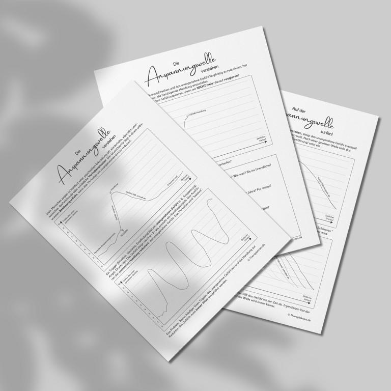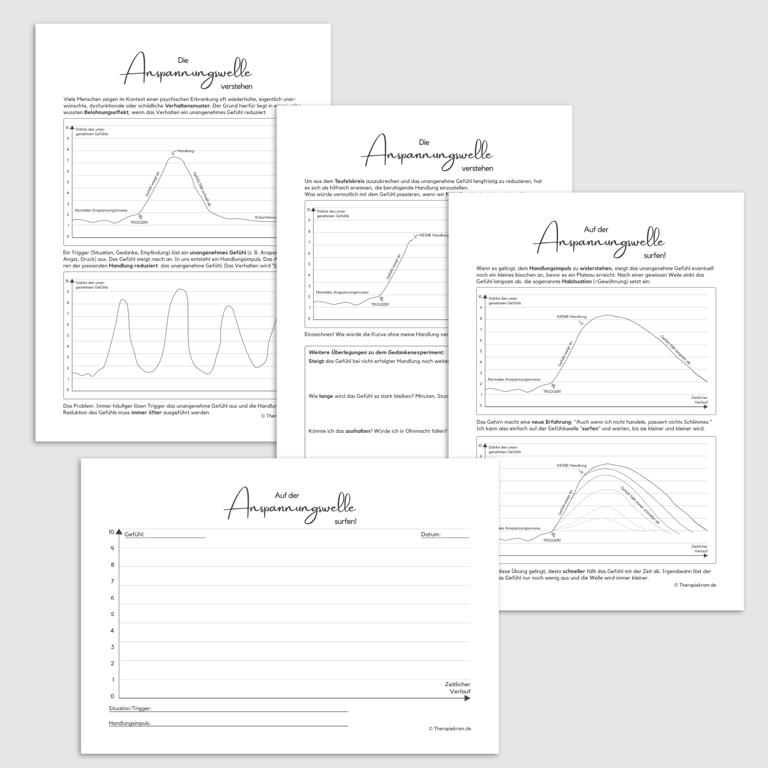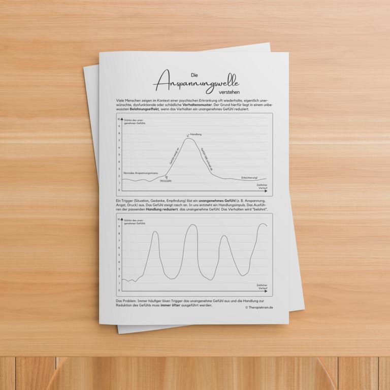 Die Anspannungskurve: Ein Modellklassiker der Verhaltenstherapie, vielseitig und störungsübergreifend anwendbar. Hier bekommst Du insgesamt vier aufeinander abgestimmte Arbeitsblätter, die Dir helfen, das Modell der Anspannungskurve psychoedukativ zu vermitteln. Auf dem ersten Arbeitsblatt wird erklärt, wie ein Trigger ein unangenehmes Gefühl auslöst, dieses bis zu einem gewissen Punkt steigt und dort eine Handlung auslöst. Nach dem Umsetzen des Verhaltensimpulses sinkt das unangenehme Gefühl schnell ab. Das Problem: Immer häufiger lösen Trigger das unangenehme Gefühl aus.