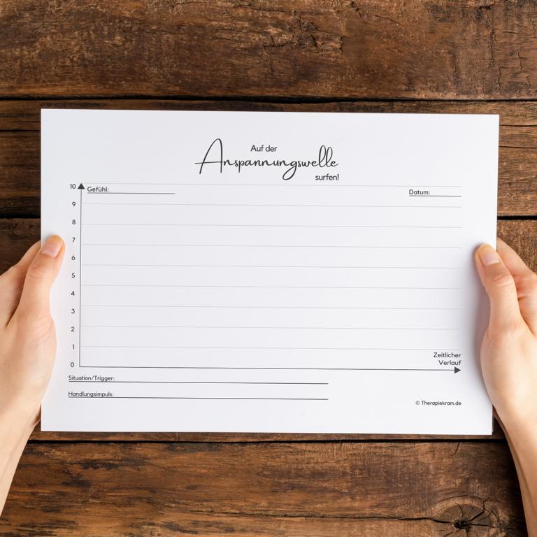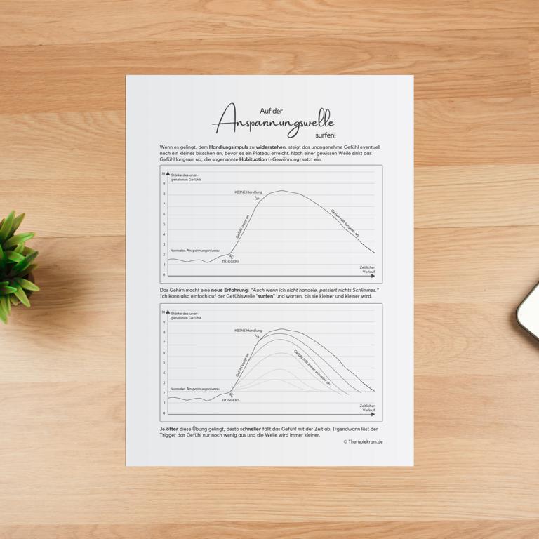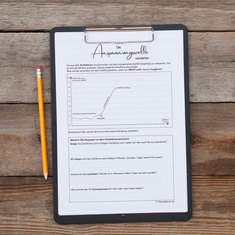 Arbeitsblatt Nr. 4 ist ein leerer Graph, auf dem Situation, Trigger und das unangenehme Gefühl eingetragen werden. Während eines Verhaltensexperiments oder einer Expositionsübung kann dann der Verlauf des Gefühls eingetragen werden. Idealerweise nehmen deine Patientinnen oder Klienten dieses Arbeitsblatt nach erfolgter Psychoedukation mit nach Hause und üben dort selbstständig, nichts zu tun.
