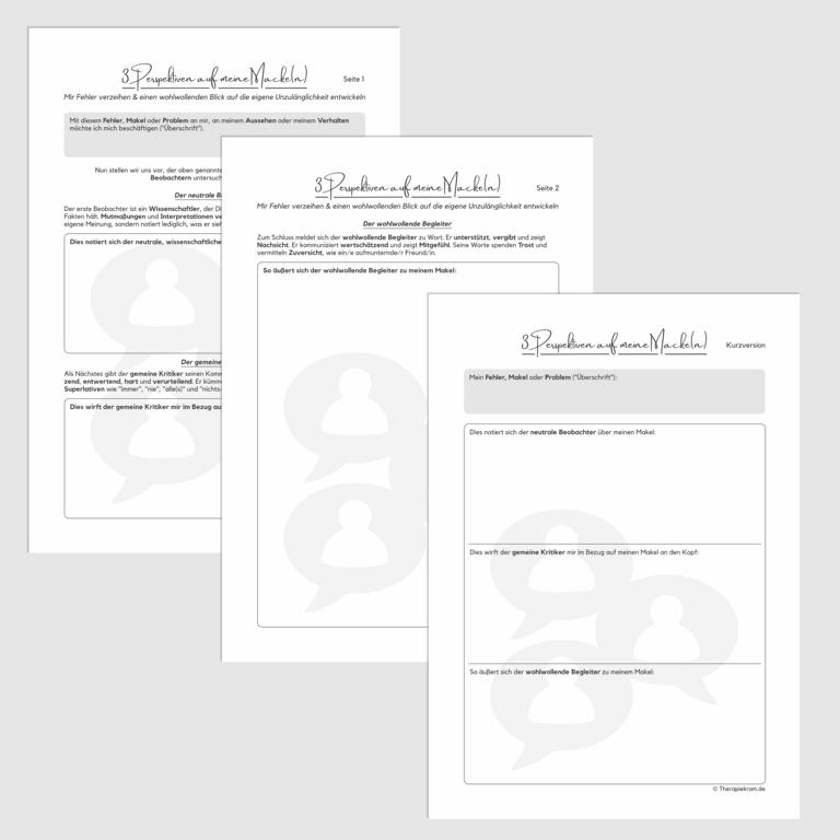 Du bekommst die 3 Perspektiven einmal als Langversion mit ausführlicher Instruktion, sodass sie fast selbsterklärend ist und gut als Hausaufgabe mitgegeben werden kann. Du erhältst außerdem eine Kurzversion für Menschen, die bereits erste Erfahrungen mit der Technik gesammelt haben und sie jetzt durch wiederholtes Üben (schließlich haben wir viel an uns selbst auszusetzen!) zu festigen.