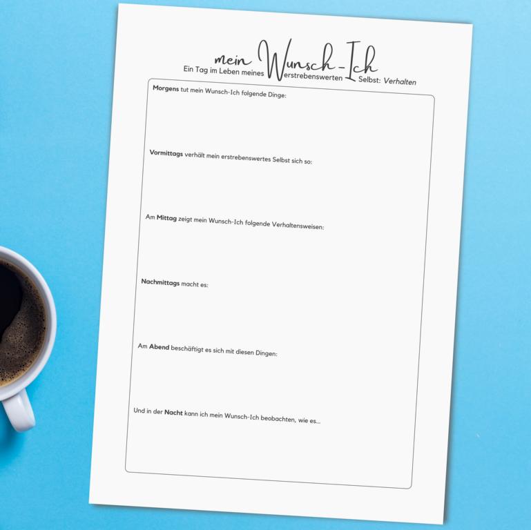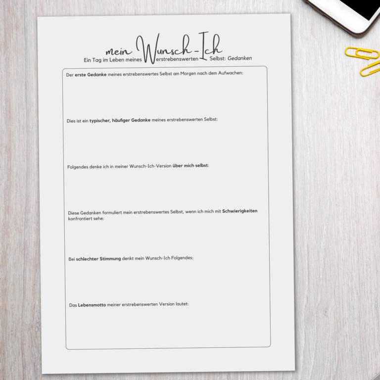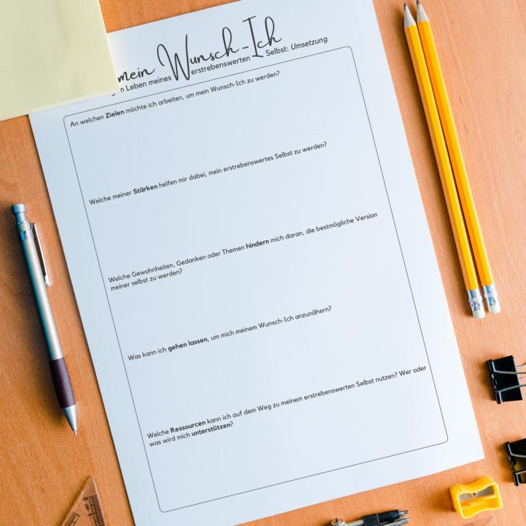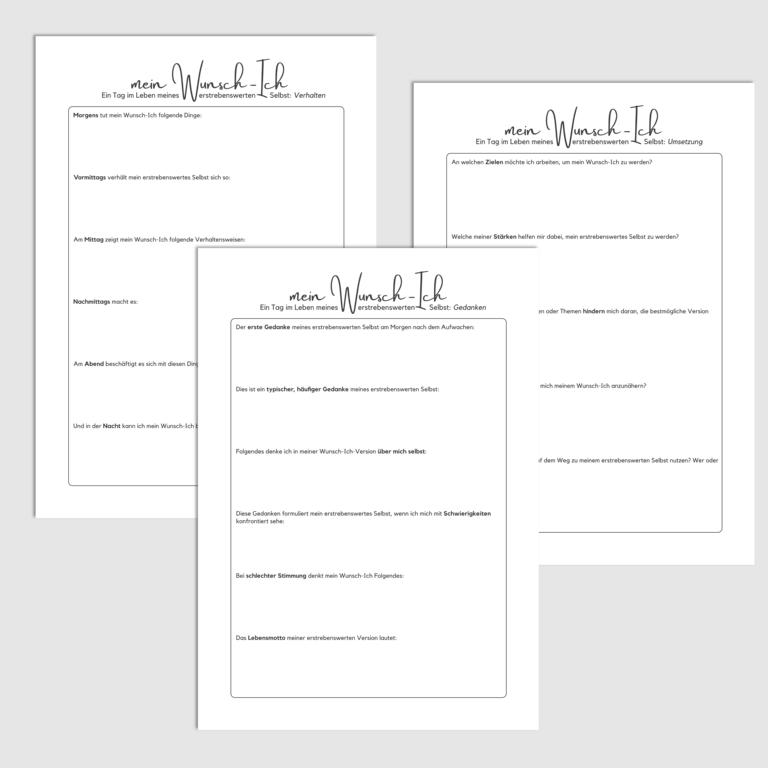 Hierbei ist das vorgestellte Arbeitsblätter-Set “Wunsch-Ich” ein hervorragender Leitfaden. Auf drei Seiten inspiriert zu konkreten Überlegungen. Wie wird sich das “Wunsch-Ich” verhalten? Wie sieht ein normaler Tagesablauf in diesem Szenario aus? Welche Gedanken hat es in verschiedenen Kontexten? Und wie sieht der Weg hin zum Wunsch-Ich aus? Was muss bewältigt, welches Ziel verfolgt werden? Welche Ressourcen helfen dabei?