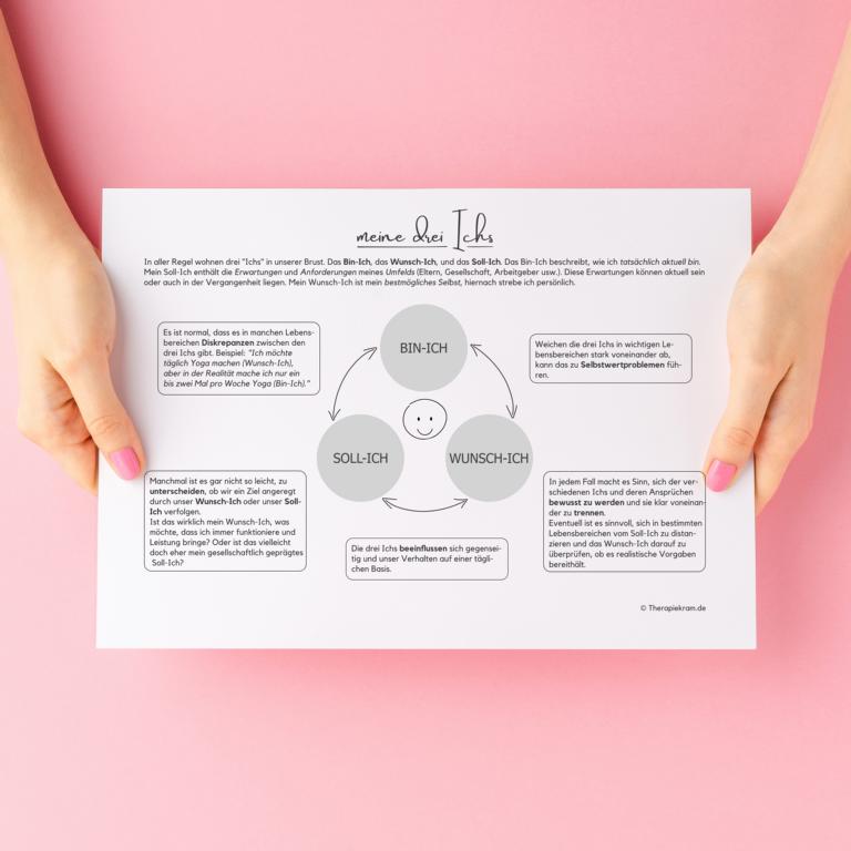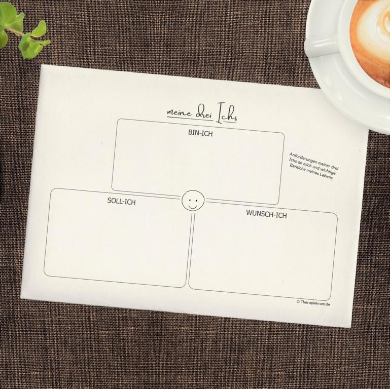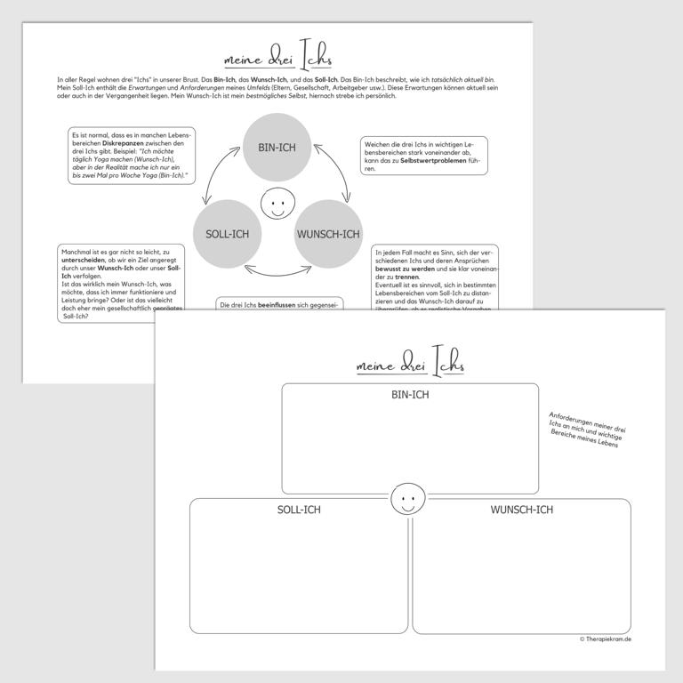 Das hier vorliegende Therapietool hilft, Diskrepanzen zwischen dem Selbst (= Bin-Ich) und dem idealen Selbst (=Wunsch-Ich). Um intrinsische Wünsche und Werte von von außen aufgelegten Erwartungen zu unterscheiden, gibt es im vorliegenden Therapietool auch noch das Soll-Ich. Dieses impliziert die diversen Anforderungen von der Umwelt.