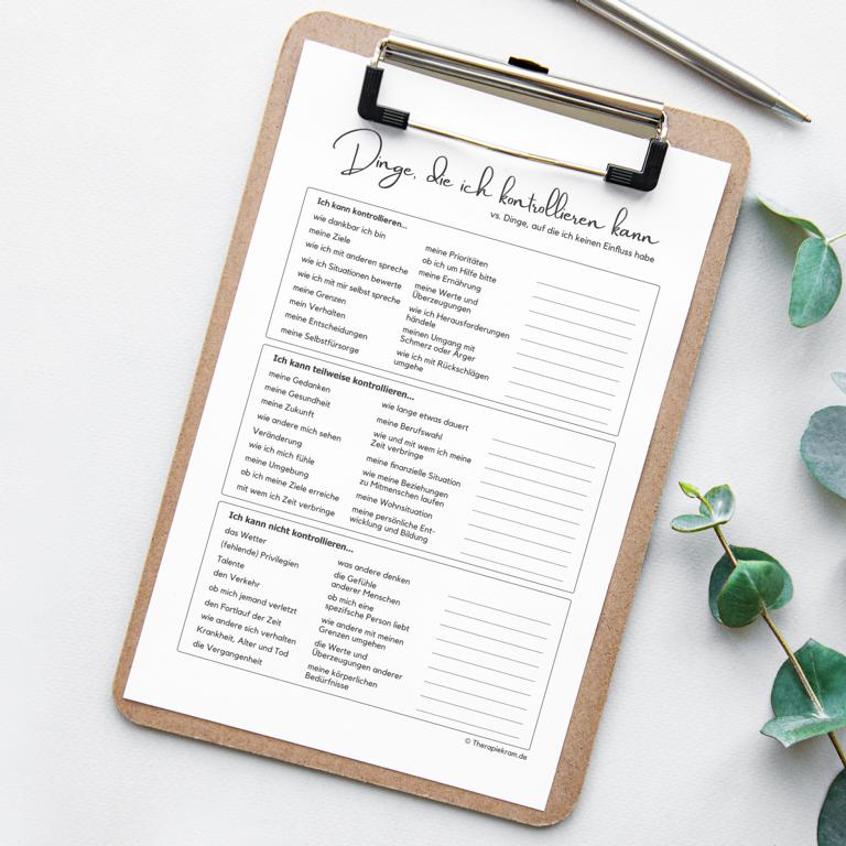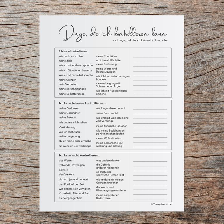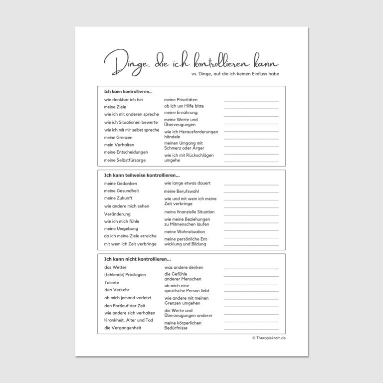 Das Therapietool enthält diverse Schlagworte zu den Bereichen “Dinge, die ich kontrollieren kann”, “Dinge, die ich teilweise kontrollieren kann” und “Dinge, die ich nicht kontrollieren kann”. Daneben gibt es Platz für eigene Gedanken und Themen, sodass das Arbeitsblatt auf den individuellen Fall angewendet werden kann.