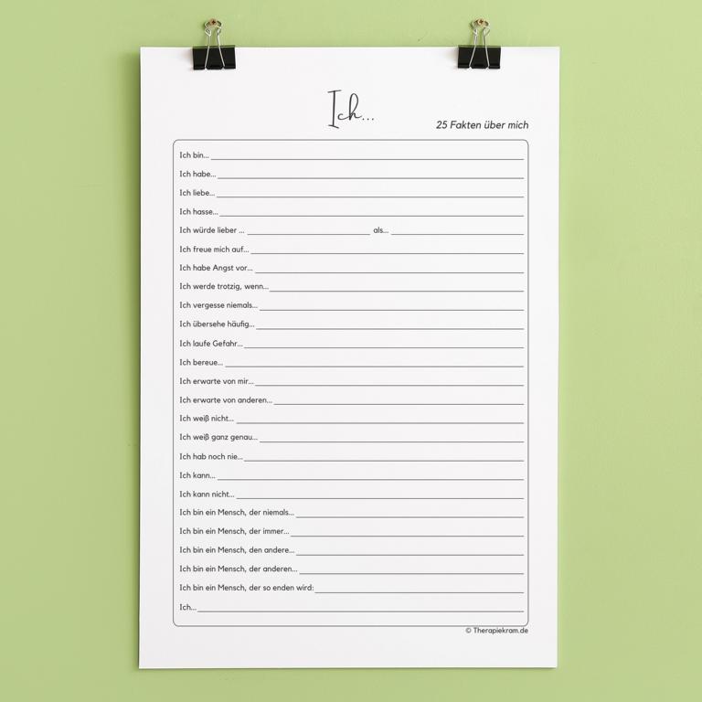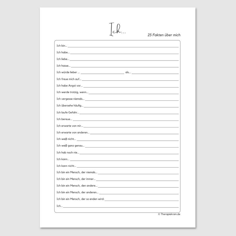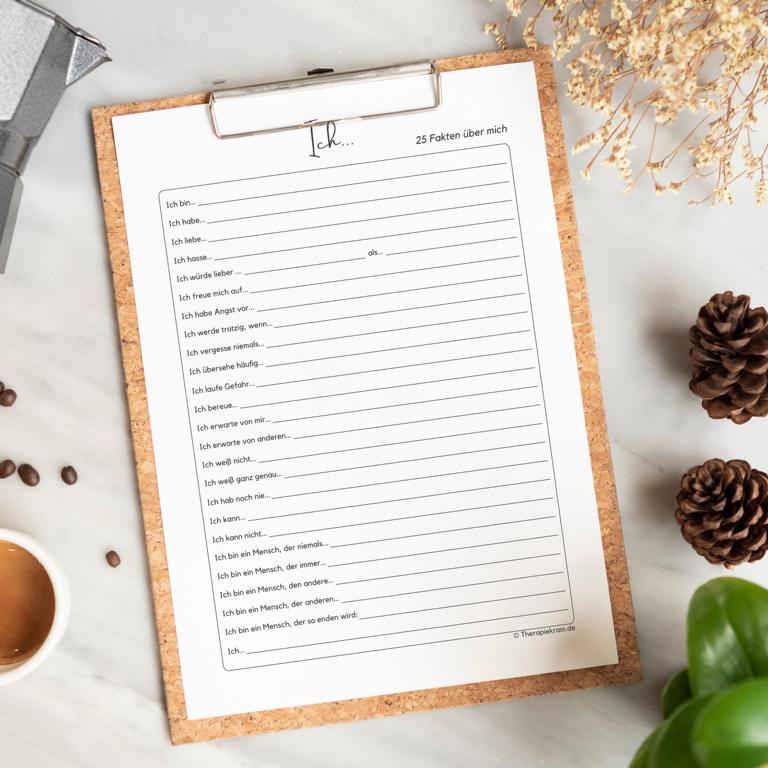 Das hier vorgestellte Therapietool richtet sich an alle Menschen, die sich ein kleines bisschen klarer über sich selbst werden wollen. 25 offen formulierte Satzanfänge regen zum Nachdenken an, bringen überraschende Erkenntnisse zum Vorschein und schaffen Gesprächsgrundlagen zu den verschiedensten Themen. Es ist ein tolles Werkzeug zum Beginn der Therapie, wenn du deine Patientin oder deinen Klienten gerne etwas näher kennenlernen möchtest und sensibilisiert beide Parteien gleichermaßen zu einem umfassenden Blick auf den ausfüllenden Menschen.