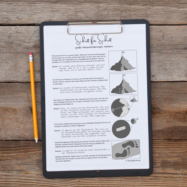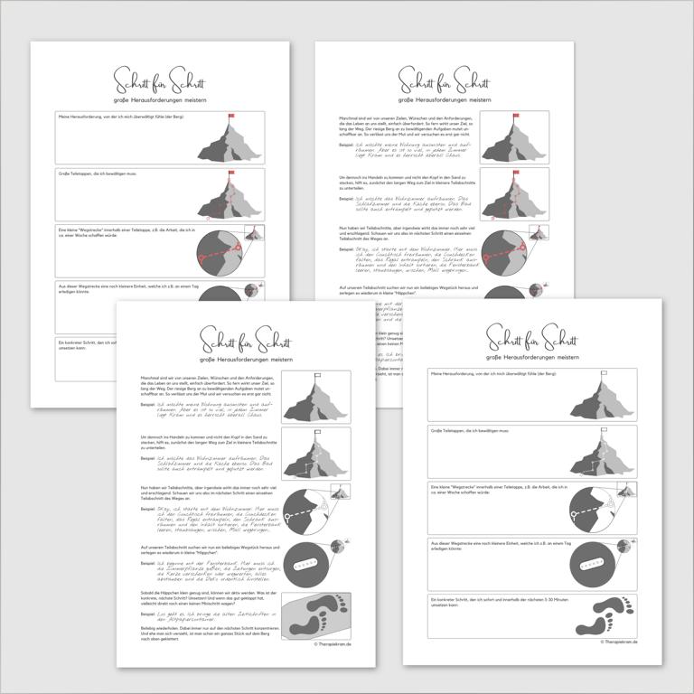 Im vorliegenden Therapietool wird der Weg zum großen Ziel mit einer Wanderung auf eine weit entfernte Bergspitze verglichen. Über mehrere Ebenen gelangt man zum Schluss zu der Anweisung, sich nur den nächsten winzigen Schritt anzuschauen. Das Arbeitsblatt ist perfekt für alle Menschen, die sich um die Zukunft sorgen und in Anbetracht des weit entfernten Ziels überfordert fühlen. Die Technik kann störungsübergreifend angewendet werden. Einmal verinnerlicht nimmt sie ganz viel Druck und Stress und hilft dabei, ins Handeln zu kommen.