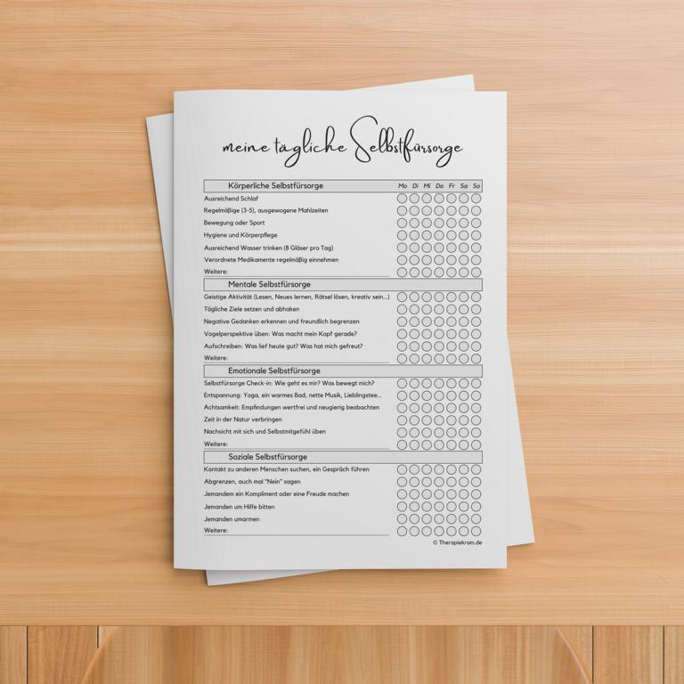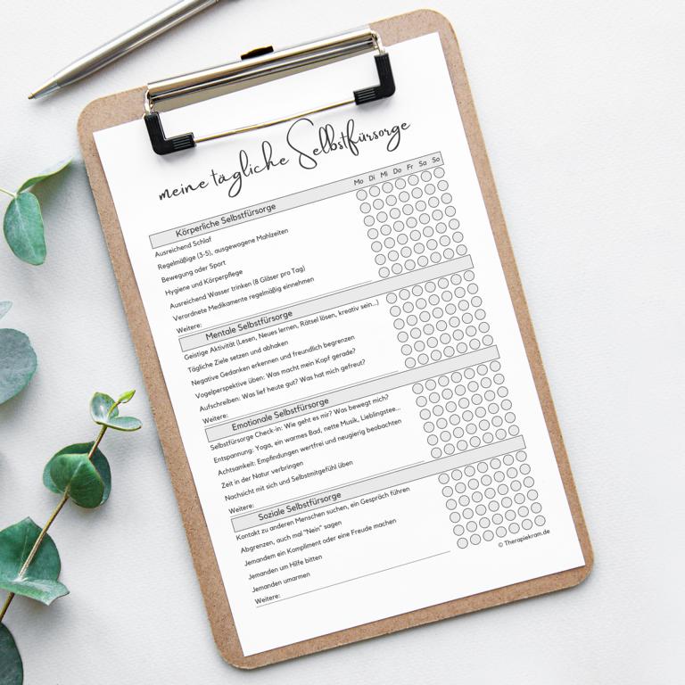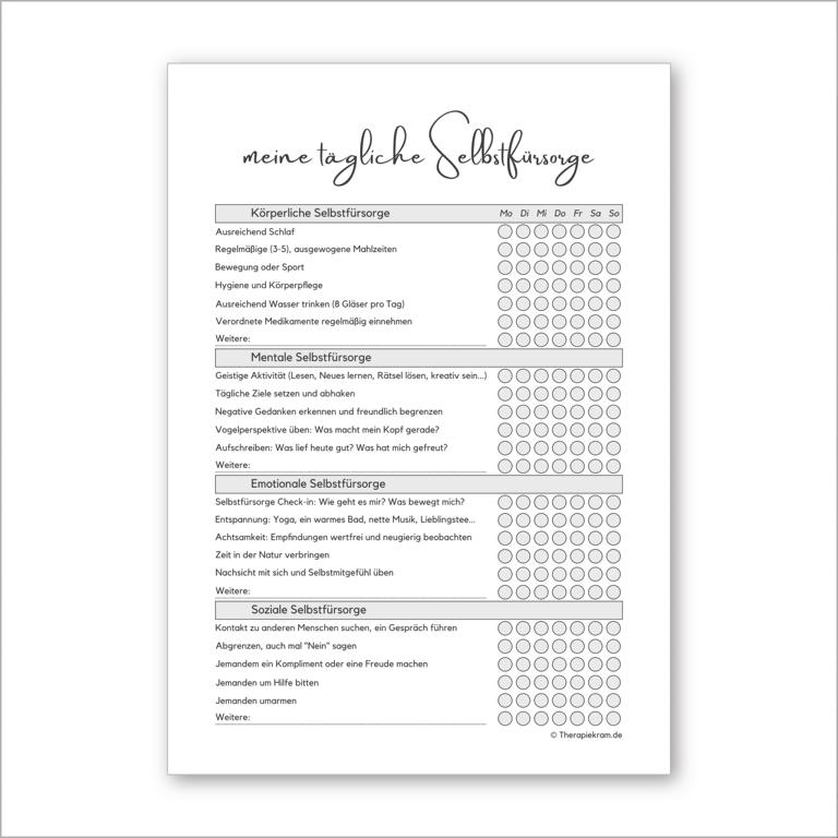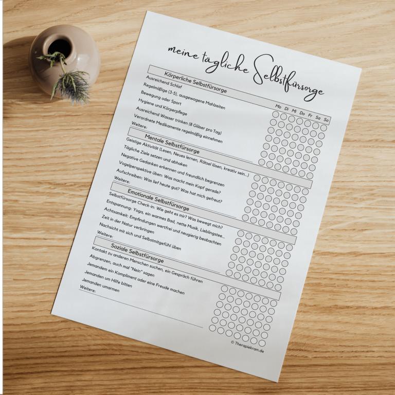 Das Arbeitsblatt enthält viele Beispiele, die auf Tages- und Wochenbasis “abgehakt” und erledigt werden können. Ein bisschen Platz für eigene Selbstfürsorge-Aktivitäten Deiner Patientinnen oder Klienten gibt es auch noch. So kann Selbstfürsorge aufgebaut oder aufrechterhalten werden, psychisches Wohlbefinden wird gesteigert und selbstfürsorgliche Routinen wirken präventiv und rückfallprophylaktisch.