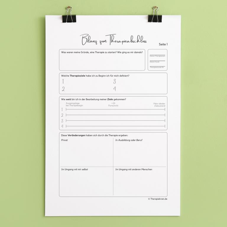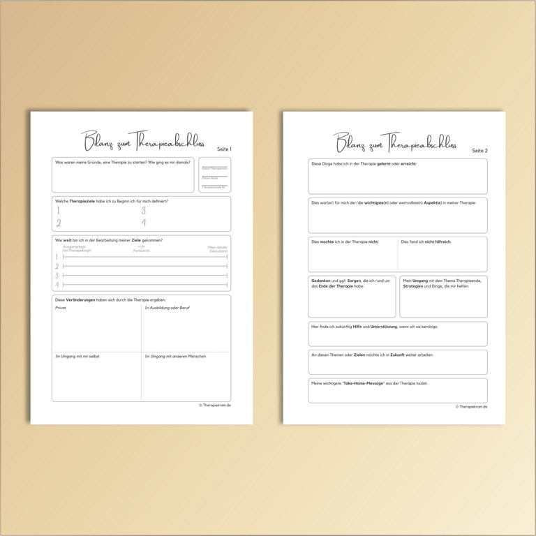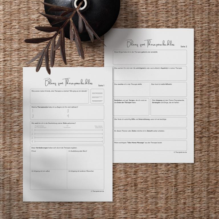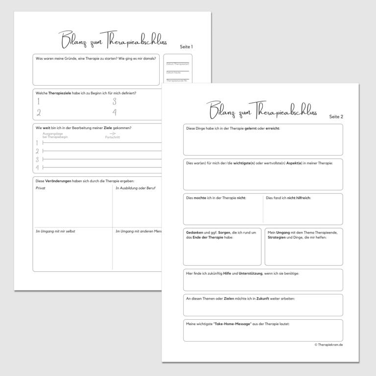 Mit dem hier vorgestellten Set gelingt das nun ganz leicht und strukturiert. Du erhältst zwei Arbeitsblätter, die noch einmal an die ursprünglich definierten Therapieziele erinnern und schauen, was aus diesen wurde. Gelerntes wird erfragt und so reaktiviert, wichtige “Learnings” können ebenso notiert werden wie Dinge, die aus Patientinnensicht nicht hilfreich oder unangenehm waren. Zweifel und Sorgen bezüglich des Therapieendes können noch mal thematisiert und aufgegriffen werden und finden ihre Antwort in sogleich zu formulierenden Ressourcen.