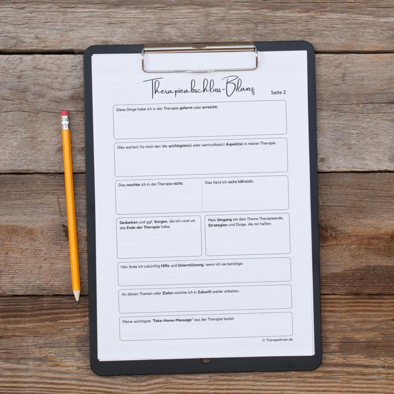 Neben der Reflexionsarbeit für deine Patientinnen oder Klienten ist die Bilanz zum Therapieende natürlich auch ein wertvolles Feedback für dich und deine Arbeit. Und ganz nebenbei hilft dir das Arbeitsblatt auch bei deinem Abschlussbericht. 🙂