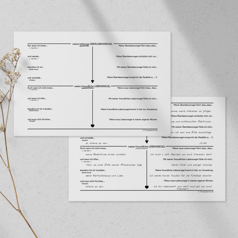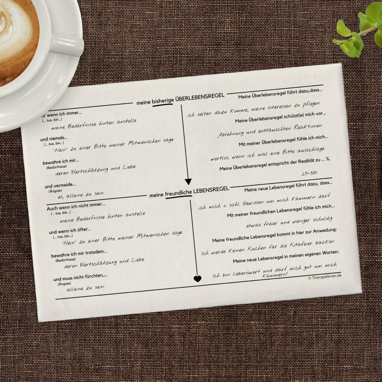 Let’s talk “Überlebensregeln”! Super wichtig um entscheidende Grundannahmen zu identifizieren, super hilfreich bei der Motivklärung und ein großer erster Schritt in Richtung Verhaltensänderung. Die Identifikation von Überlebensregeln (vgl. Strategisch behaviorale Therapie von Serge Sulz) gelingt mit dem vorliegenden Arbeitsblatt ab sofort kinderleicht. Mit vier einfachen Fragen werden Überlebensregeln identifiziert und im zweiten Schritt in neue, hilfreiche Lebensregeln umgewandelt. Um die Überlebensregeln greifbar zu machen, finden sich neben den klassischen Fragen auch Elemente aus dem motivational interviewing. So finden deine Patienten oder Klientinnen nach der Theorie auch gleich einen Einstieg in die Umsetzung. Pro Überlebensregel wird ein Arbeitsblatt ausgefüllt. Zunächst mit deiner Hilfe während der Sitzung, später auch gerne alleine Zuhause. Um das Arbeitsblatt zu veranschaulichen, kommt es mit einem vorausgefüllten Beispiel, anhand dessen transparent dargestellt wird, worum es bei den Fragen geht. Must have in der Verhaltenstherapie sowie in systemischen Settings!