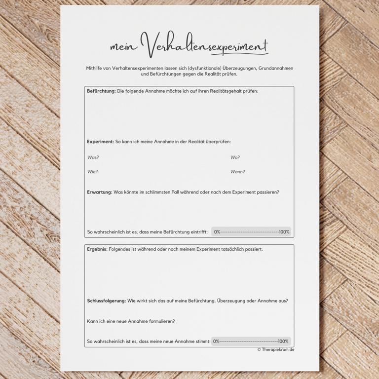 Mit dem vorliegenden Therapietool kannst das Thema Verhaltensexperiment gemeinsam mit deinen Patienten und Klientinnen nun noch ein kleines bisschen strukturierter angehen. Nach einer kurzen, gemeinsamen Einarbeitungszeit hilft das Arbeitsblatt deinem Klientel, Verhaltensexperimente auch selbstständig Zuhause zu planen und umzusetzen. Verzerrte Denkweisen können so schnell und nachhaltig korrigiert werden. KVT Basic!