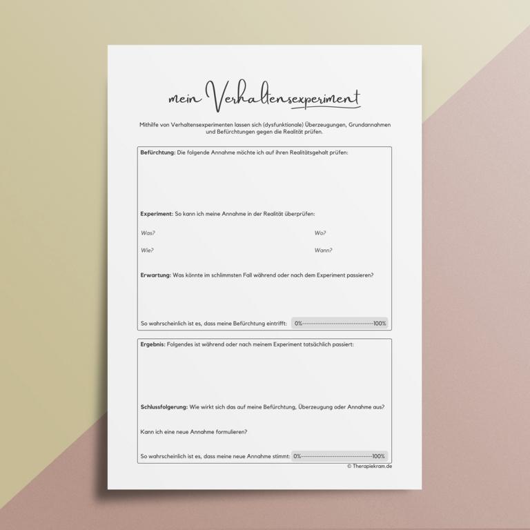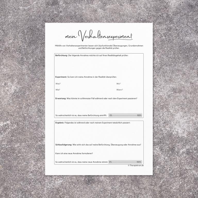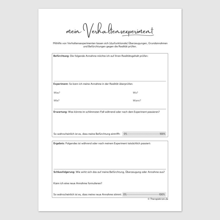 Das Verhaltensexperiment dient dazu, (dysfunktionale) Annahmen und Überzeugungen in der Realität zu überprüfen. Die Technik des Verhaltensexperiments ist ein Klassiker der kognitiven Verhaltenstherapie und findet bei einer ganzen Reihe von Störungsbildern und Problemen seine Anwendung. Überall dort, wo hinderliche Kognitionen und Denkprozesse das Wohlbefinden stören und die Verhaltensflexibilität limitieren, kommt es zum Einsatz.