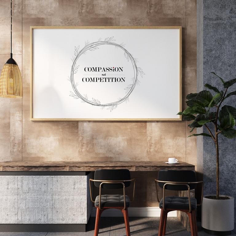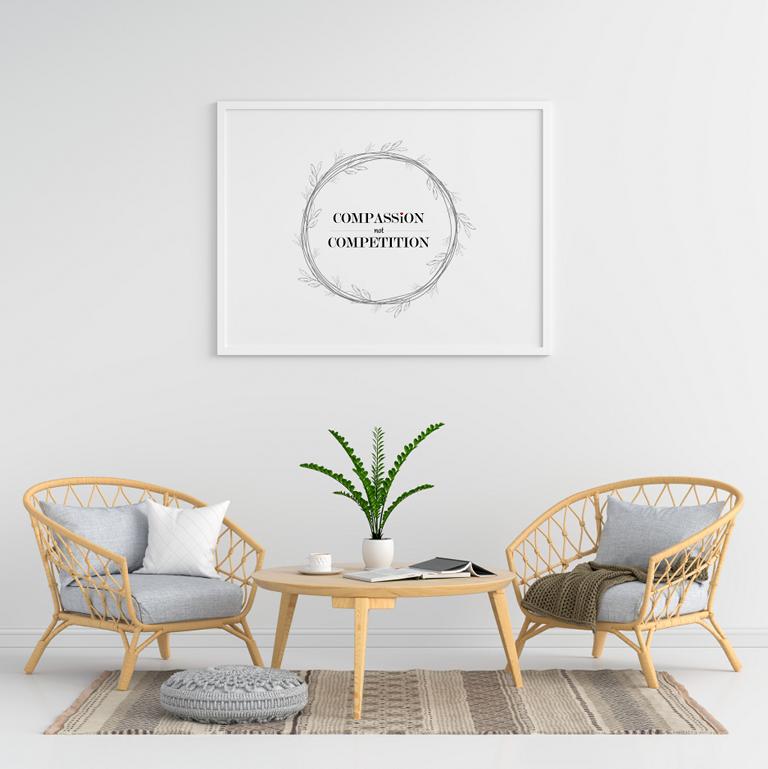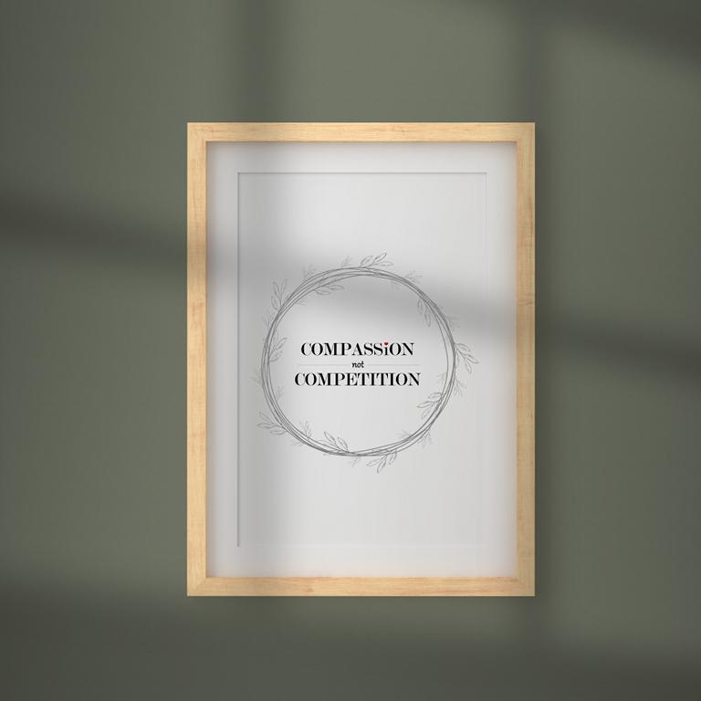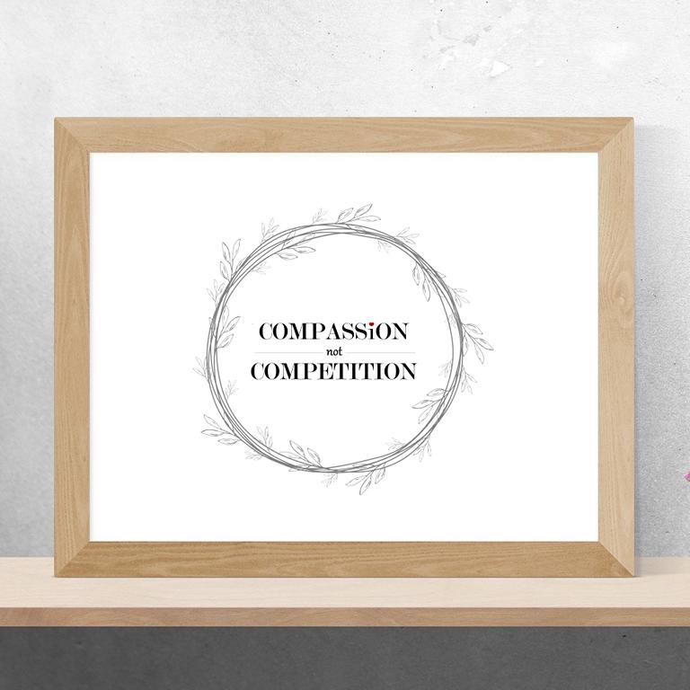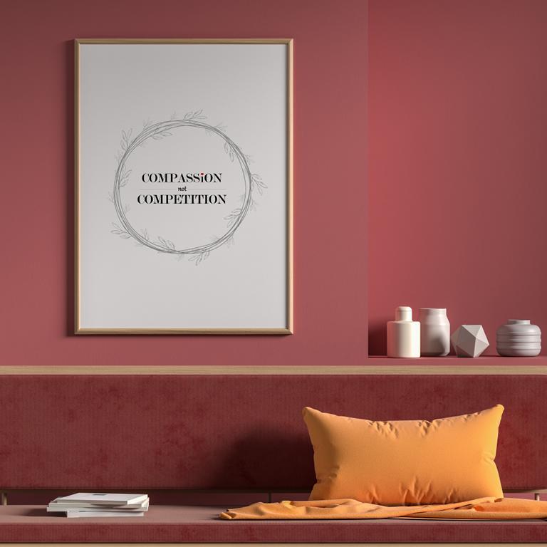 Compassion, not competition! Die Idee zu diesem Poster kam mir auf dem World Congress of Cognitive and Behavioral Therapies 2019 in Berlin, auf dem ich einem Vortrag von Steven Hayes über sein Herzenskind “ACT” beiwohnen durfte. Mr. Hayes erzählte seine Geschichte und wie er selbst mit mentalen Problemen kämpfend schließlich das Grundkonzept der Acceptance and Commitment Therapy entwickelte. Eine der Säulen von ACT ist das “Mitgefühl” – vor allem auch gegenüber sich selbst. Mr. Hayes stellte eindrücklich dar, wie wir alle viel weniger Druck, Konkurrenzkampf und “muss muss muss” und dafür viel mehr Selbstmitgefühl und Empathie für unsere Mitmenschen brauchen. Recht hat er – und so gibt es das Compassion Poster jetzt als klares Statement für Deine Praxis, dein Wohnzimmer oder dein Yogastudio – ganz, wie Du magst.