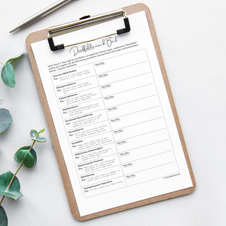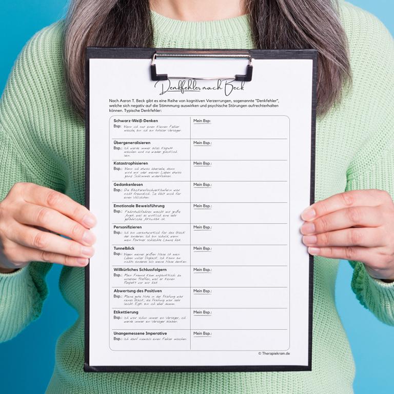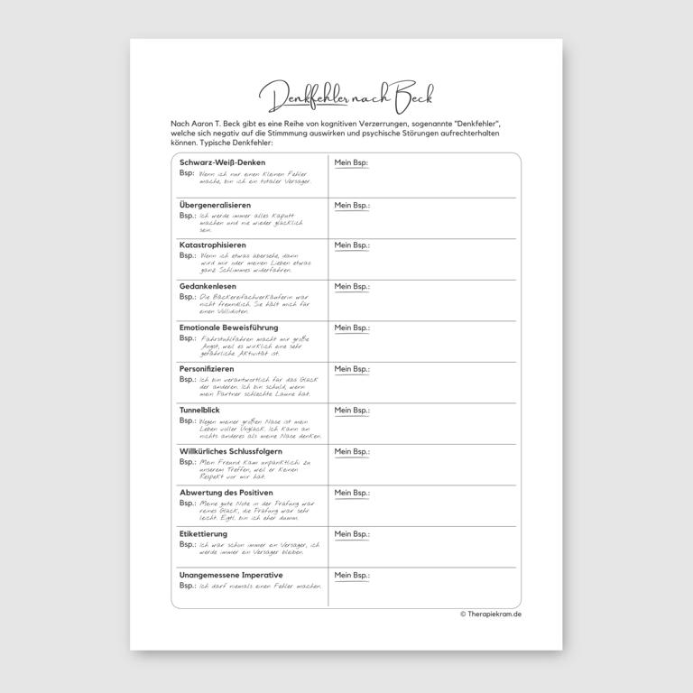 Das Arbeitsblatt der Denkfehler nach Beck ist für dich eine gute Arbeitsgrundlage in der kognitiven Umstrukturierung. Es enthält die wichtigsten kognitiven Fehler nach Beck und veranschaulicht diese anhand von konkreten Beispielen. Auf der rechten Seite finden deine Patientinnen oder Klienten Platz, um ihre eigenen Beispiele einzutragen.
