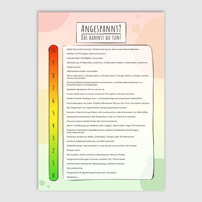 Je nach aktuellem Anspannungszustand kommen verschiedenste therapeutische und selbstfürsorgliche Aktivitäten in Frage. Eine bunte Auswahl an Strategien, Tools und Skills können deine Patientinnen oder Klienten dem hier vorgestellten Poster entnehmen: Einfach links die Höhe der Anspannung einordnen und dann rechts mögliche Interventionen ablesen.
