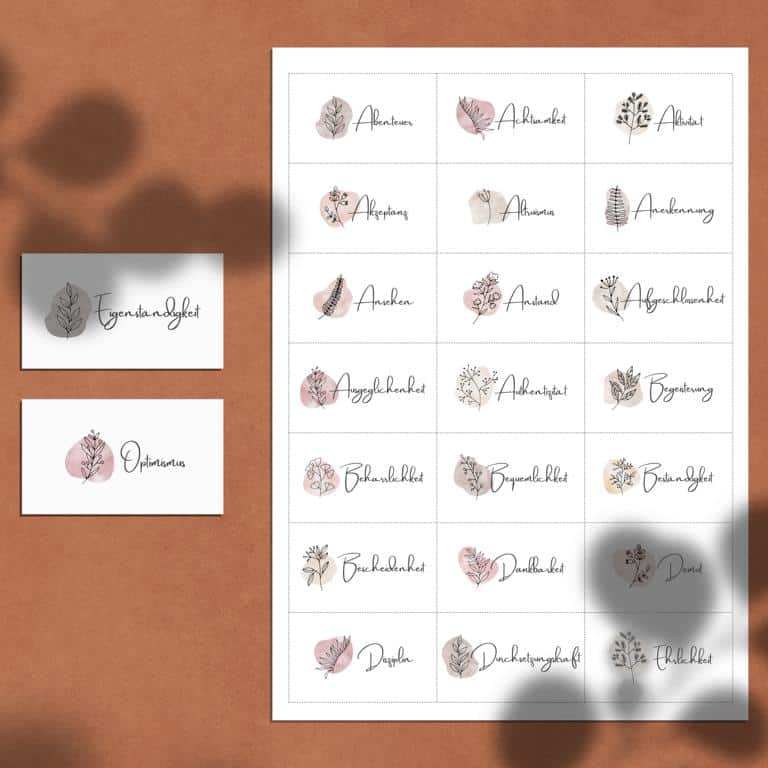 Du erhältst hier fünf digitale PDF Dateien mit insgesamt 105 Werten. Die Dateien sind im A3 Format angelegt, sodass du relativ große Karten ausdrucken (lassen) kannst, natürlich kannst du sie auch als A4 ausdrucken. Eine Wertekarte ist im A4 Ausdruck am Ende ca. 10-5,5 cm groß.